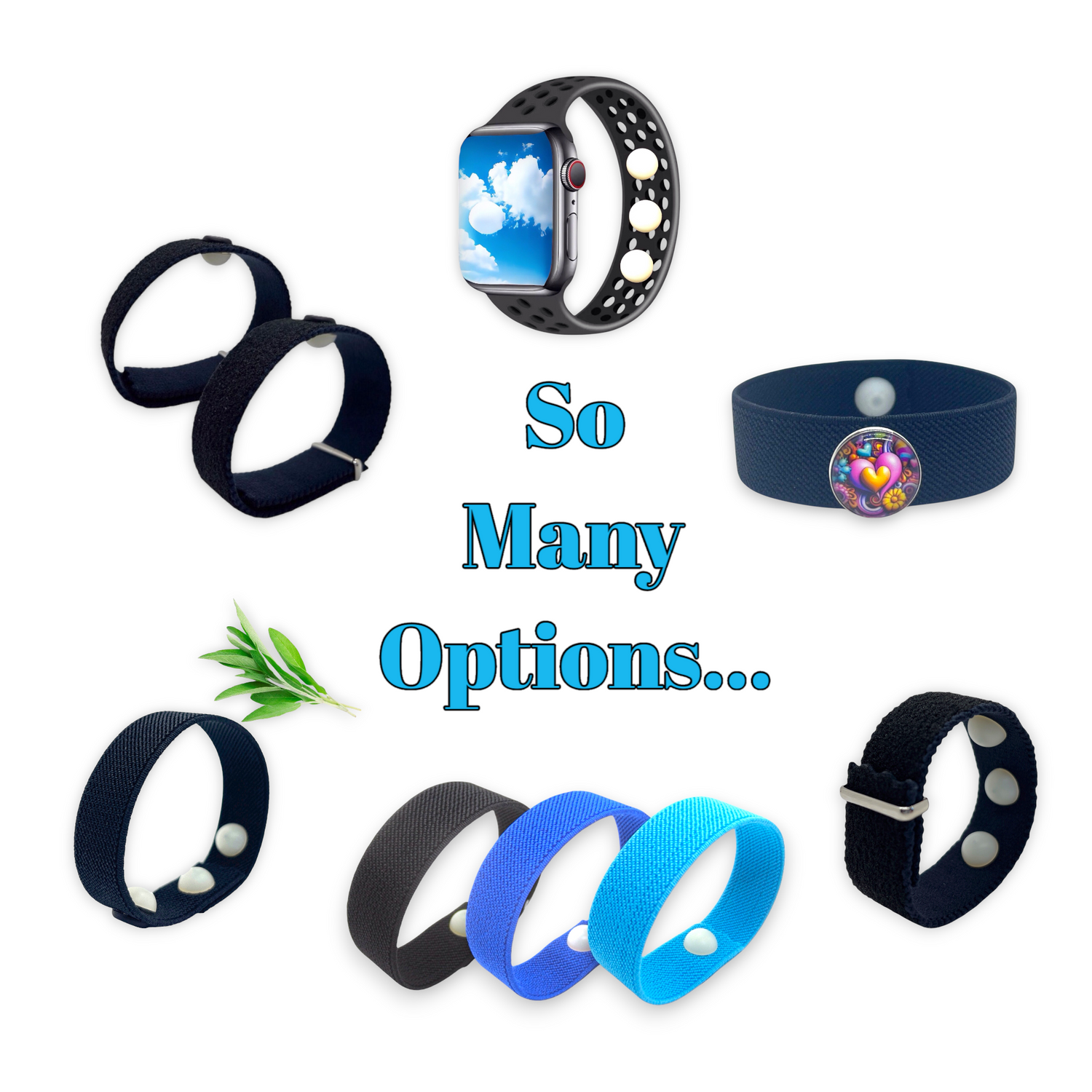 Single and multi symptom styles compatible with Apple iWatch. Convenient and discreet support for anxiety, nausea, balance, and sleep.