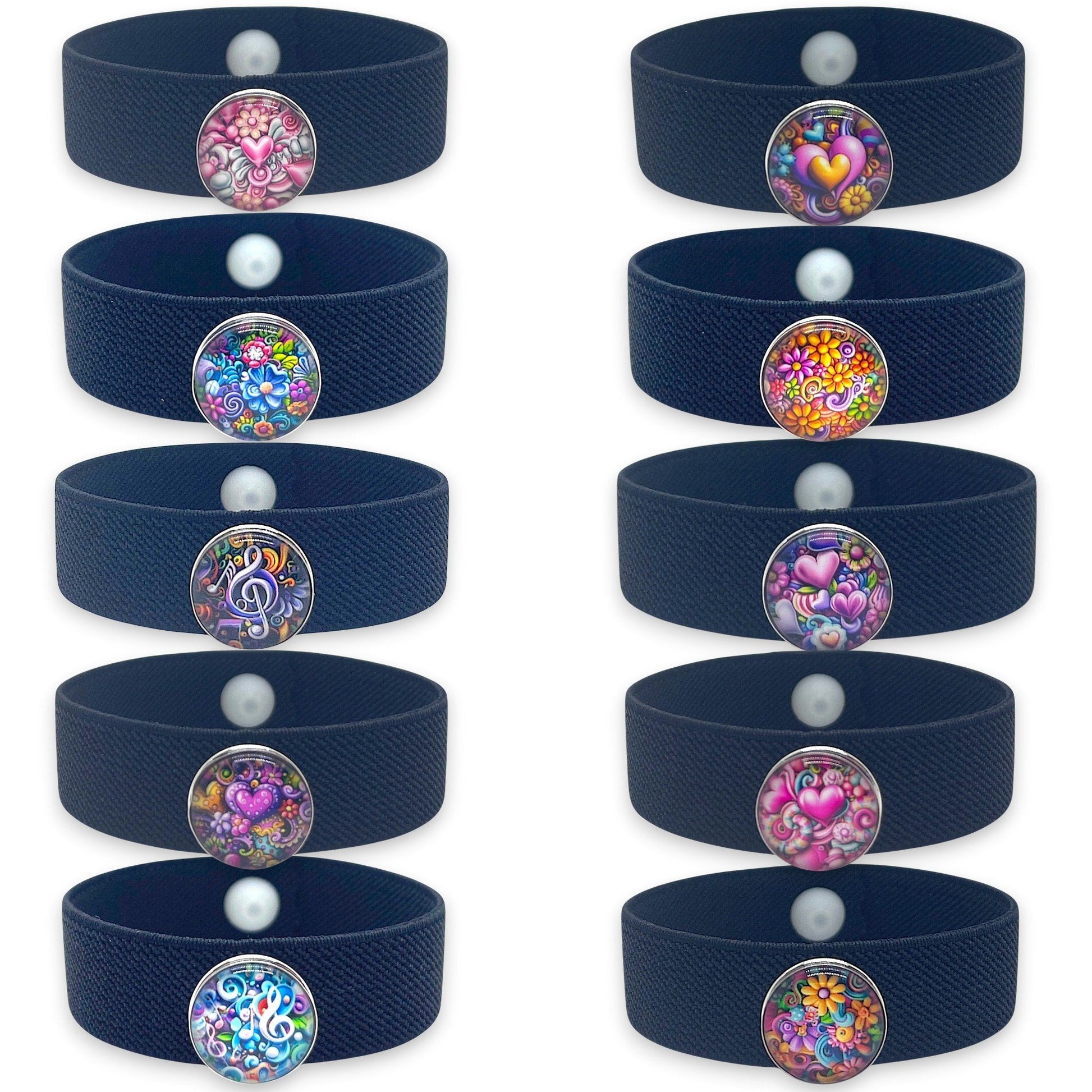 Each bracelet includes: Slip On acupressure band + your choice of one snap button charm