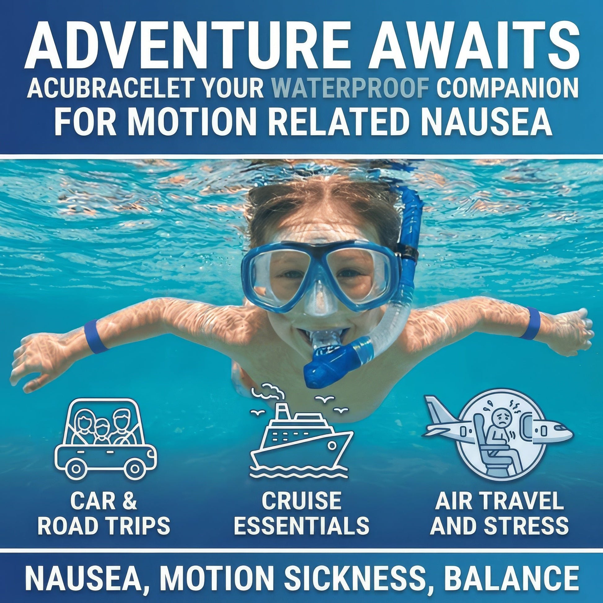 These waterproof acupressure wristbands are designed to be worn on both wrists to support motion and nausea relief on the go 🤢. Made for boats, cars, planes, and water activities, they press on a key wrist point often used for nausea and travel support.